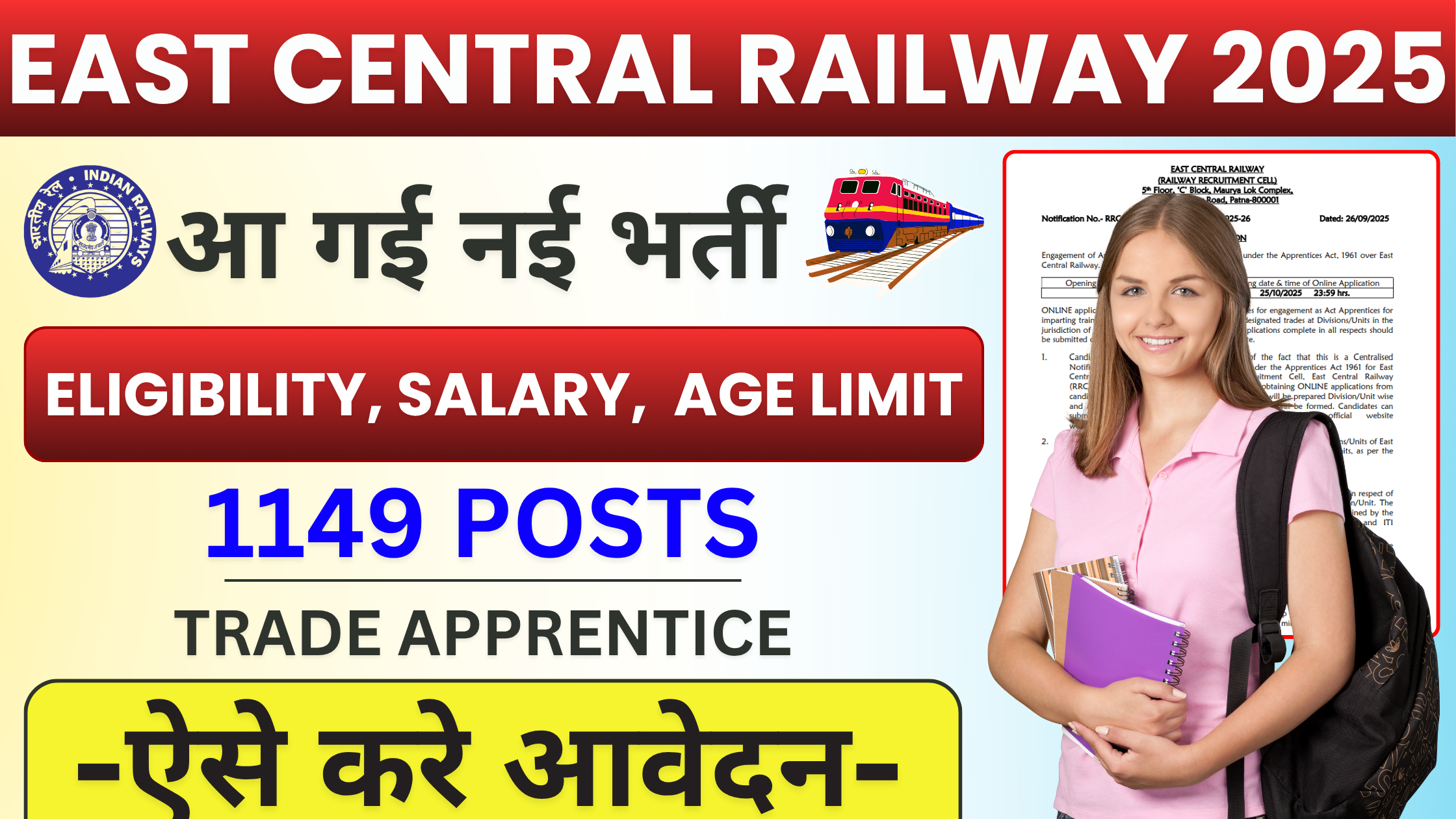 Railway Recruitment Cell (RRC) East Central Railway, Patna ने Trade Apprentice Recruitment 2025 का नोटिफिकेशन जारी कर दिया है। इस भर्ती में कुल 1149 पद निकाले गए हैं। यह अवसर उन युवाओं के लिए है जिन्होंने ITI Trade में सर्टिफिकेट प्राप्त किया है और रेलवे में Apprenticeship करना चाहते हैं। 📊 Job Overview Table विवरण … Read more