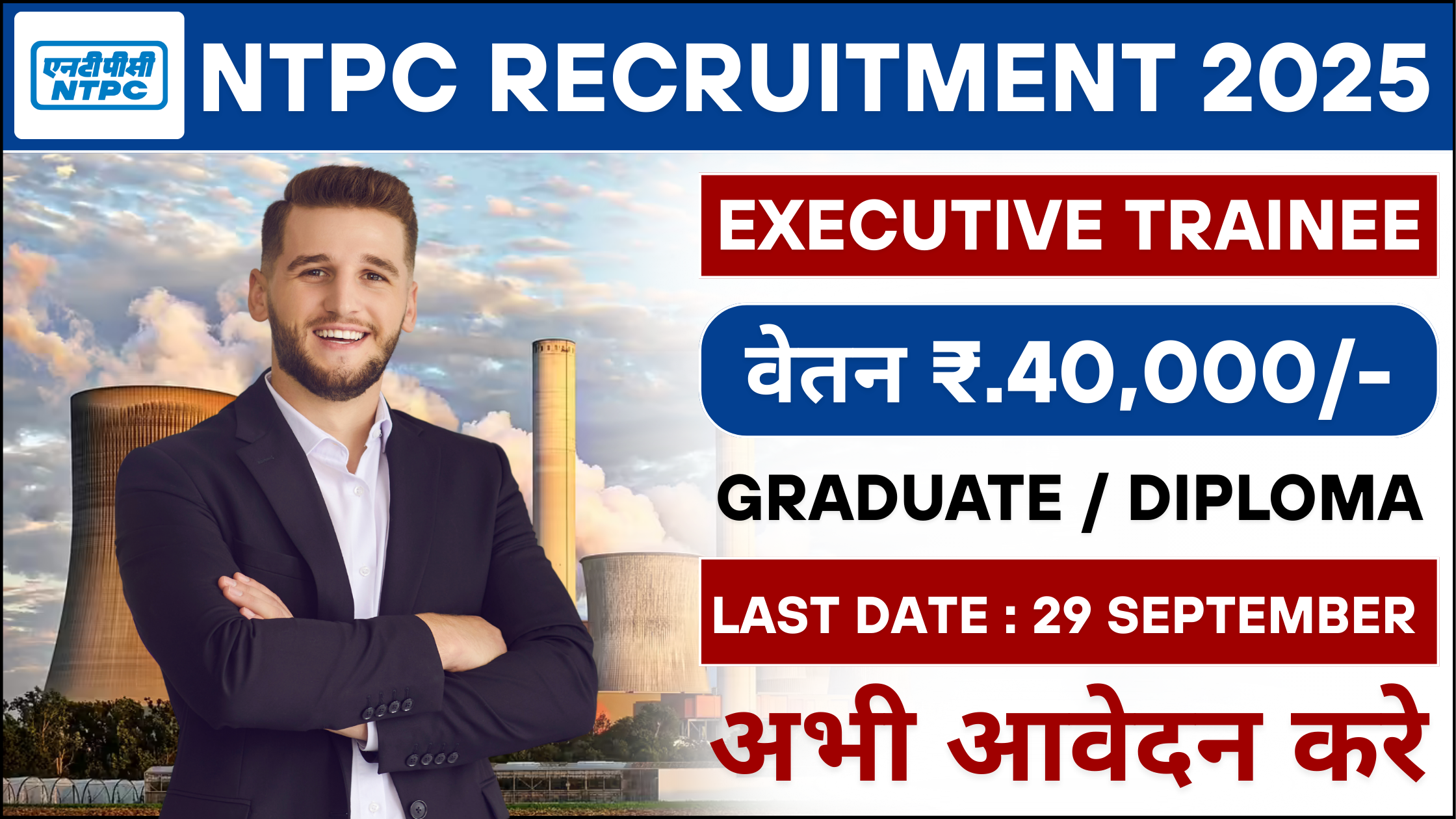 National Thermal Power Corporation (NTPC) ने Executive Trainee Recruitment 2025 का आधिकारिक नोटिफिकेशन जारी किया है। इच्छुक और योग्य उम्मीदवार 26 अगस्त 2025 से ऑनलाइन आवेदन कर सकते हैं। इस भर्ती के तहत कुल 15 पदों को भरा जाएगा। आवेदन करने की अंतिम तिथि 09 सितम्बर 2025 है। 📌 NTPC Executive Trainee Recruitment 2025 Overview … Read more