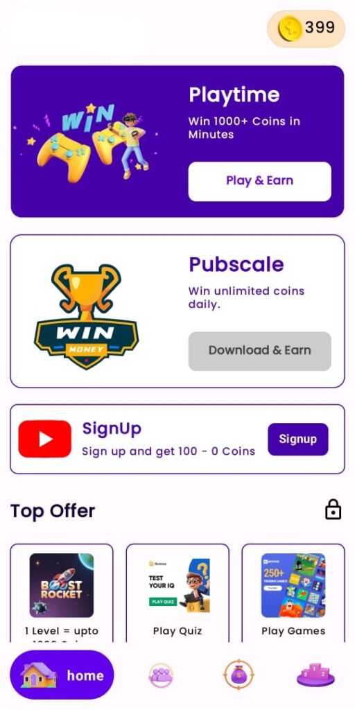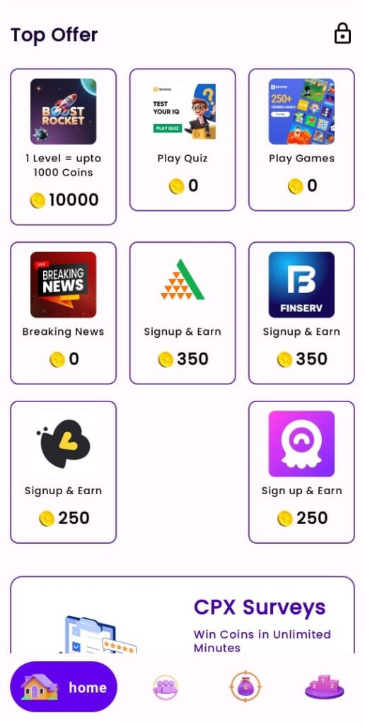 Step 2: जैसे आप लोग पहली बार इस एप्लीकेशन के ऊपर साइन अप करके आ जाते हो तो आपके सामने सारे कमाई के तरीके अपनी कितनी कमाई की है और आपका पूरा डैशबोर्ड और बाकी सभी ऑप्शनओपन हो जाते हैं.