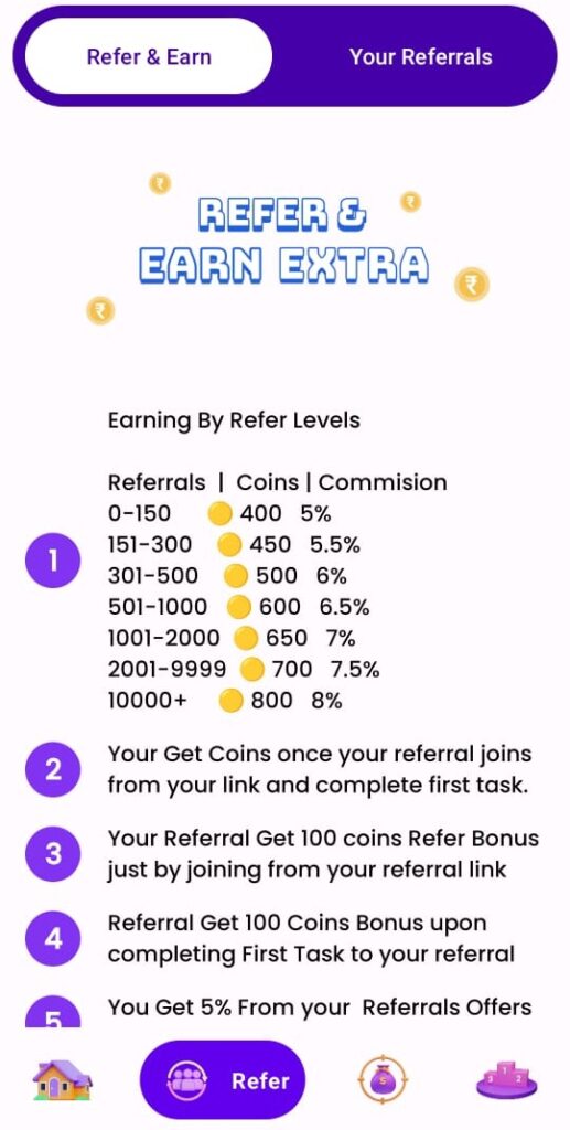 Refer and Earn : इस एप्लीकेशन को आप लोग अपने दोस्तों के साथ शेयर करके भी कमाई कर सकते हो यहां पर आपको फिक्स अमाउंट तो नहीं लेकिन कुछ परसेंटेज वह जितना भी काम आएगा उसका कुछ परसेंटेज आपके वॉलेट के अंदर क्रेडिट किया जाता है अगर आपको यहां पर कुछ भी नहीं करना तो आप यह तरीका अपना सकते हो
