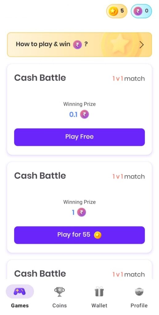 अब आते हैं में चीज पर कि आप यहां पर लूडो खेल कर कैसे कमाए कर सकते हो जैसे आप बॉटम मेनू में गेम्स के ऊपर क्लिक करते हो तो आपके सामने कुछ इस तरह की स्क्रीन आएगी जिसमें आपको अलग-अलग तरह के बैटल देखेंगे जिसमें आप पार्टिसिपेट करके यहां पर पैसे कमाई कर सकते हो