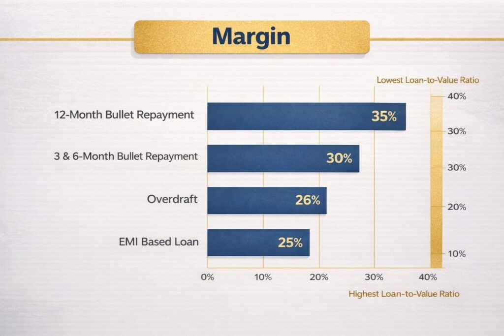 Margin का मतलब है कि बैंक सोने की कुल कीमत का पूरा amount loan के रूप में नहीं देता।
