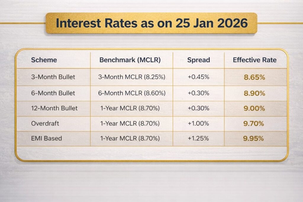 Interest rate समय-समय पर बदल सकता है क्योंकि यह MCLR benchmark पर आधारित होता है।